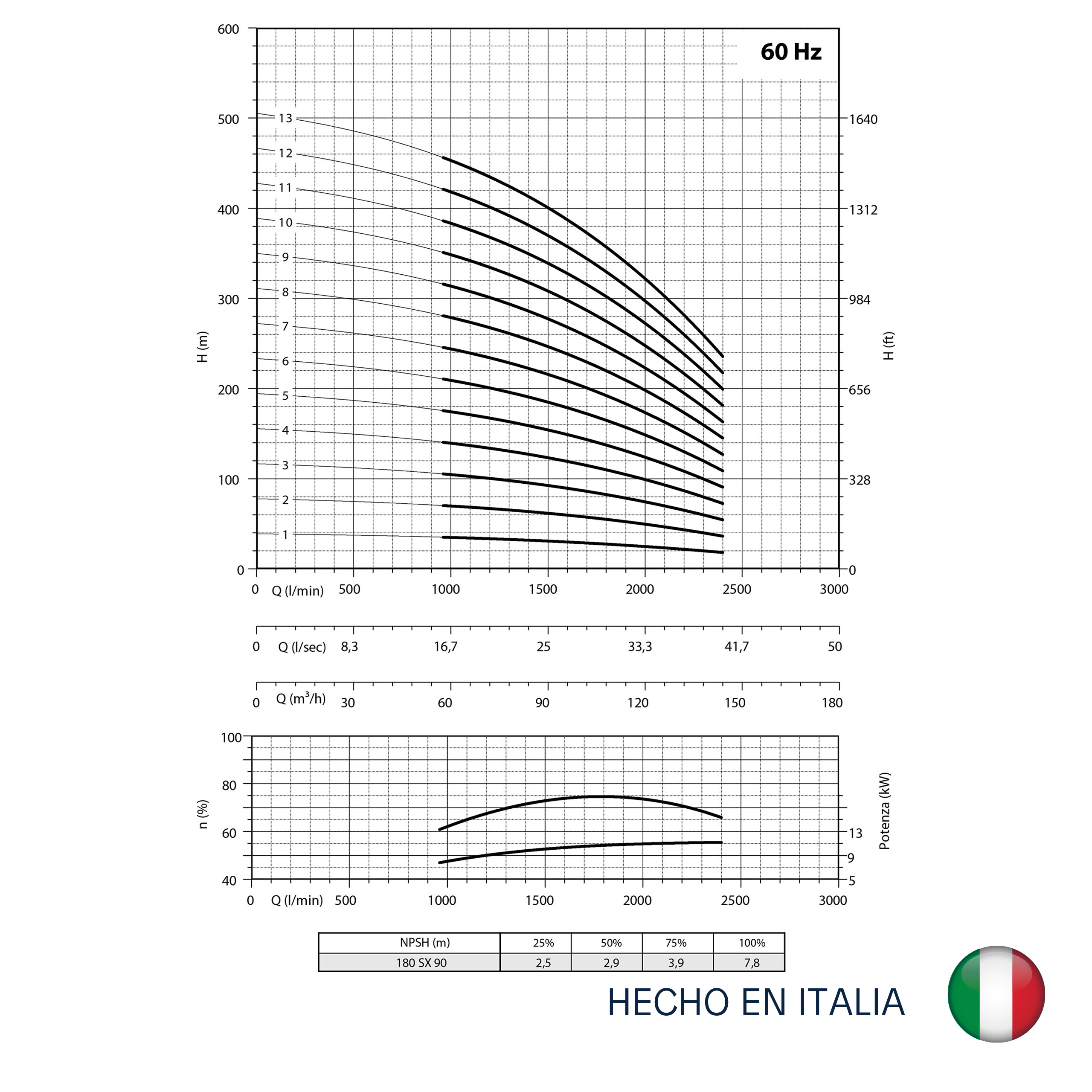 Caudales hasta 420 m³/h Altura manométrica hasta 510 m Potencia hasta 250 kW Cantidad máx. de arena contenida en el agua: 50g/m³ Sumergencia máx.: 350 metro